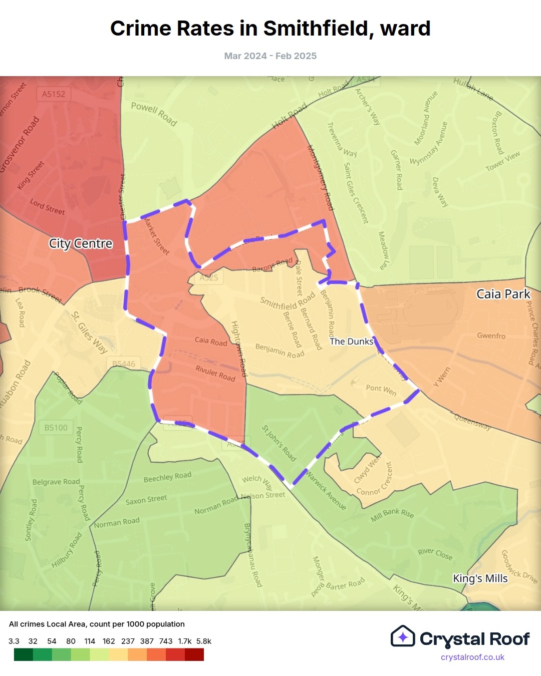 Smithfield (ward) is located within Wrexham (borough). Annual total crime rate in Wrexham (borough) is 105 crimes per thousand resident population, which can be rated as 5 out of 10 or medium crime level compared to other local authority districts in England and Wales.