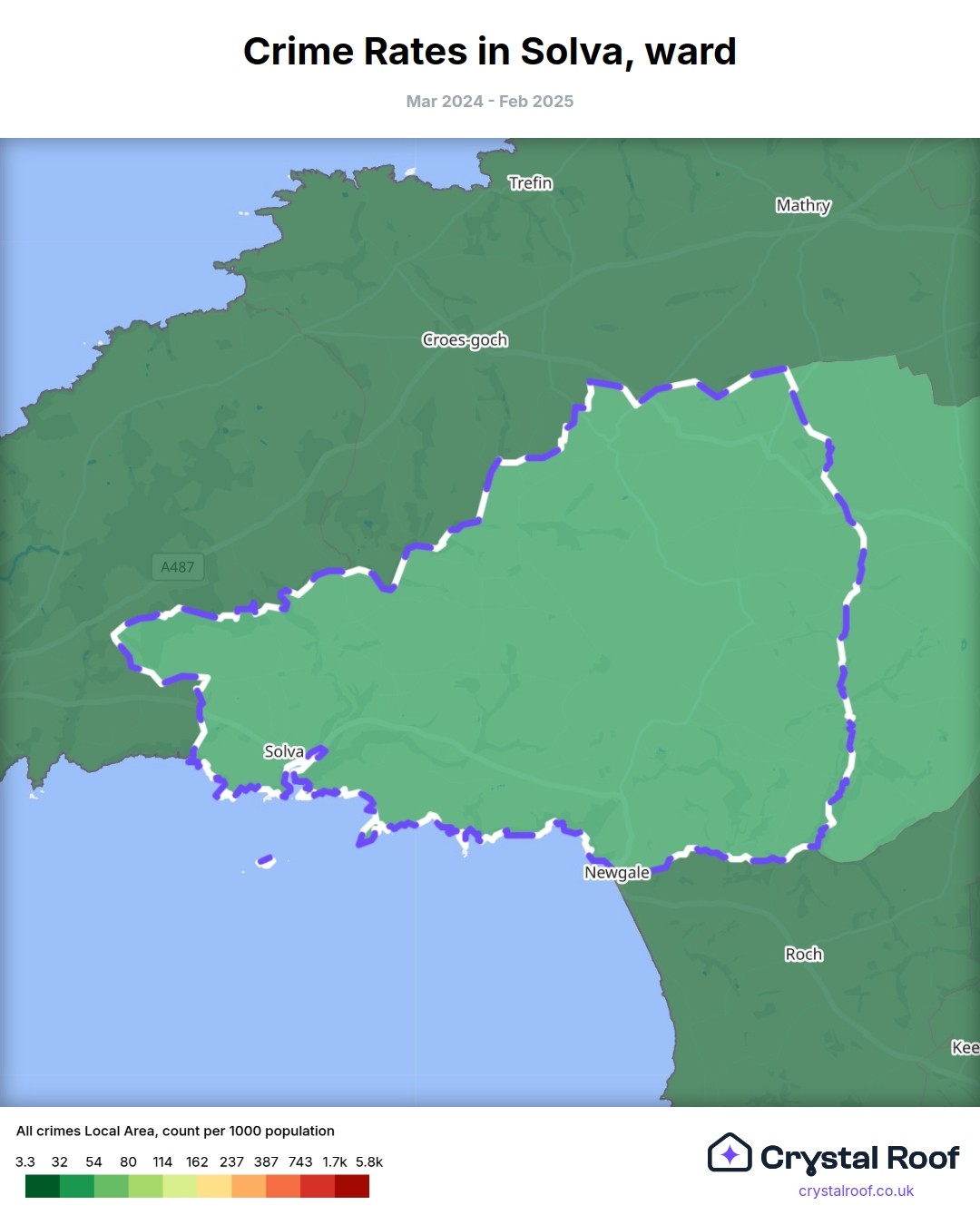 Solva (ward) is located within Pembrokeshire (borough). Annual total crime rate in Pembrokeshire (borough) is 85 crimes per thousand resident population, which can be rated as 3 out of 10 or low crime level compared to other local authority districts in England and Wales.