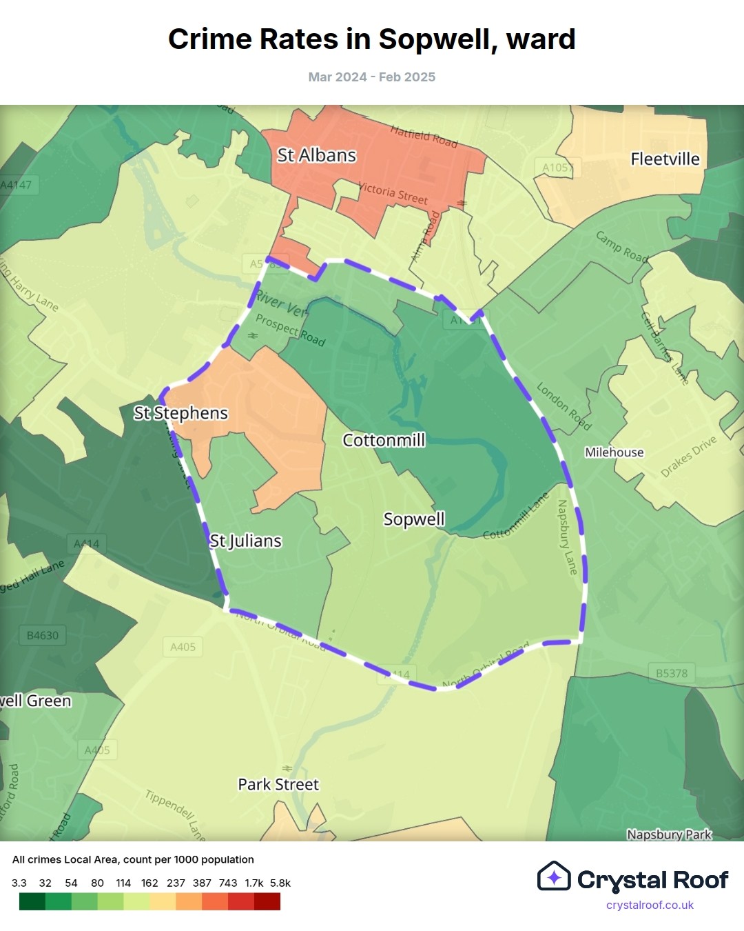 Sopwell, (ward) includes areas with the following crime ratings (see map):