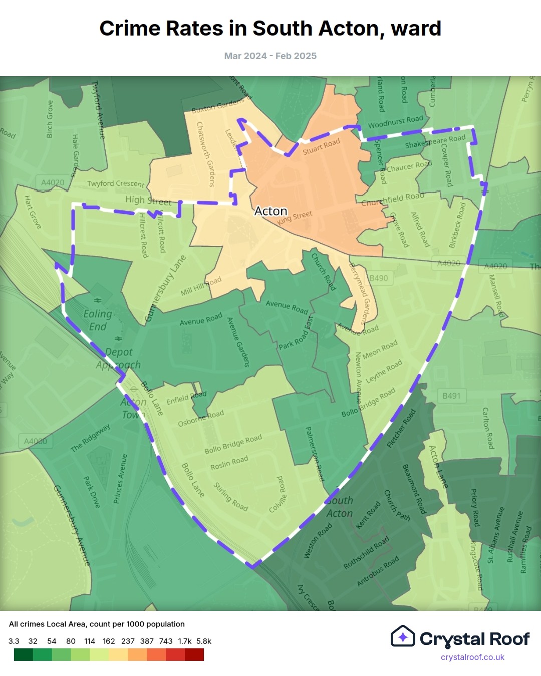 South Acton, (ward) includes areas with the following crime ratings (see map):
