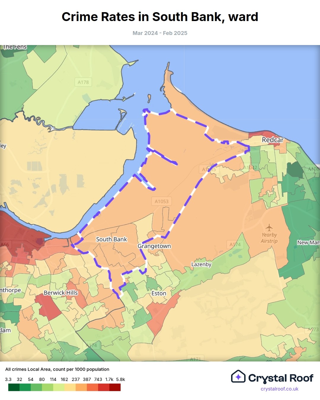 South Bank (ward) is located within Redcar and Cleveland (borough). Annual total crime rate in Redcar and Cleveland (borough) is 139 crimes per thousand resident population, which can be rated as 7 out of 10 or high crime level compared to other local authority districts in England and Wales.