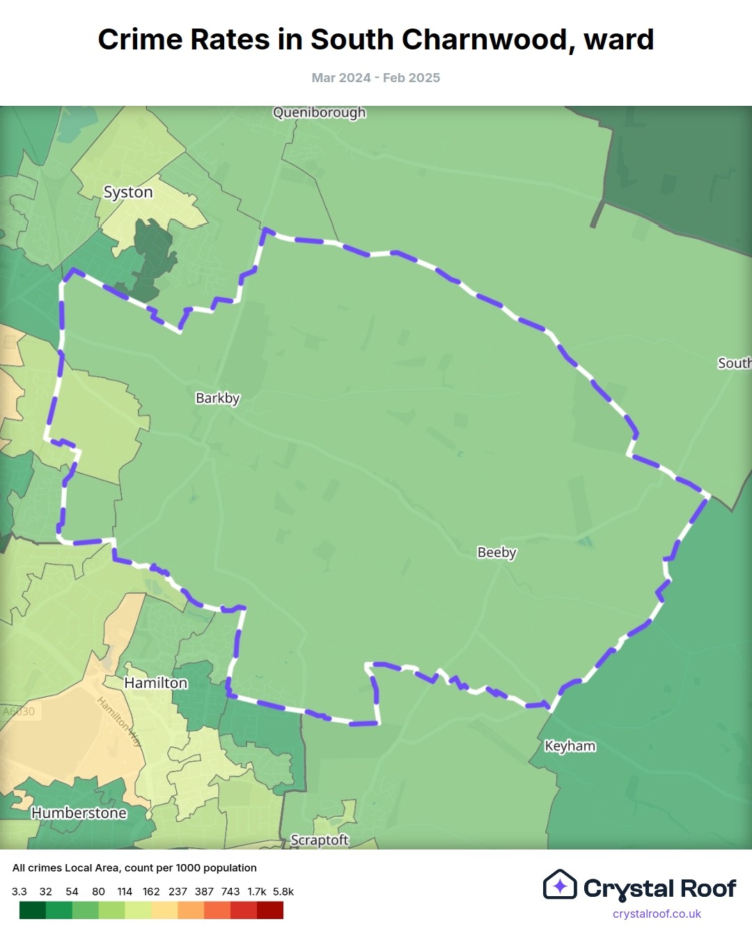South Charnwood, (ward) includes areas with the following crime ratings (see map):
