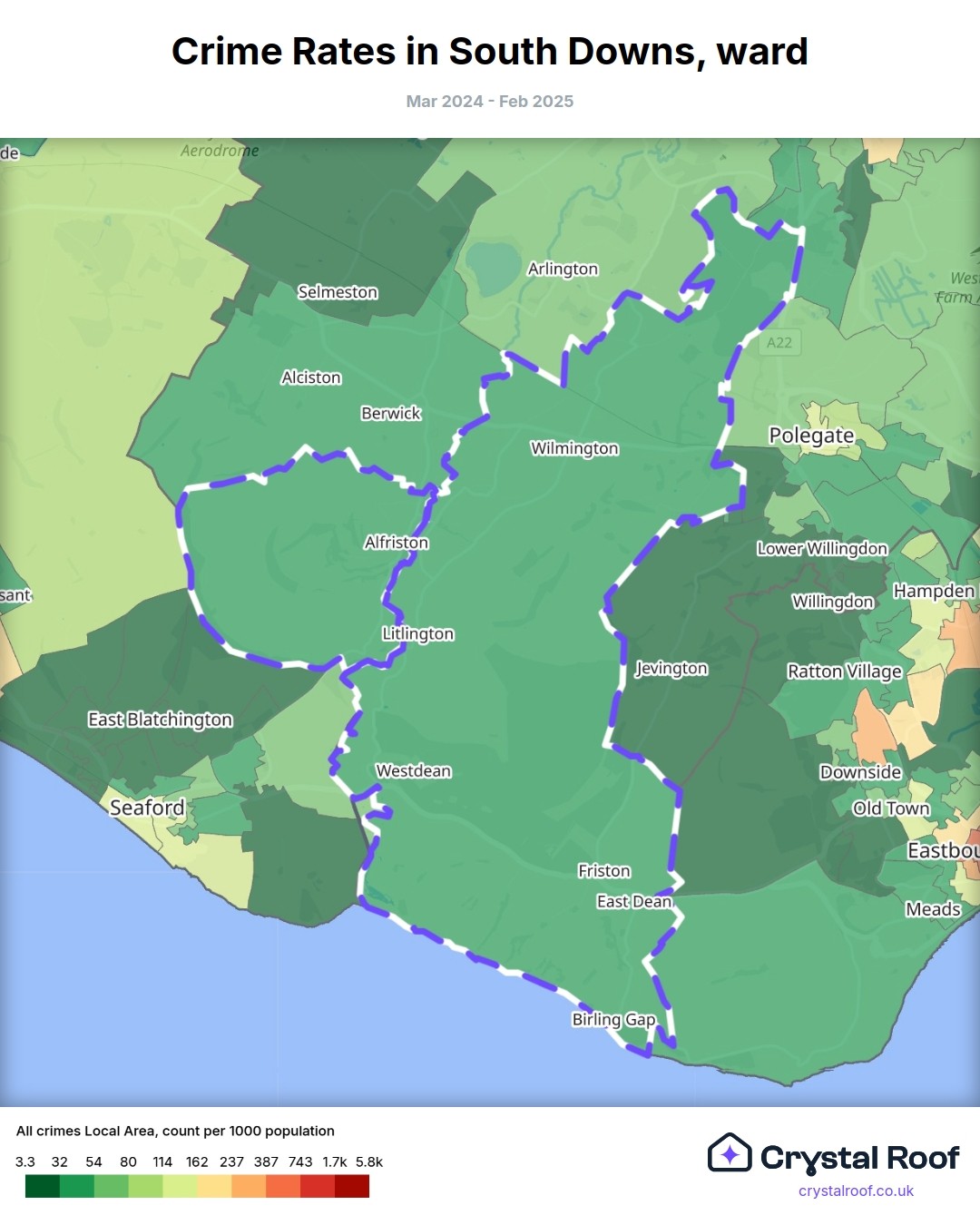 South Downs, (ward) includes areas with the following crime ratings (see map):