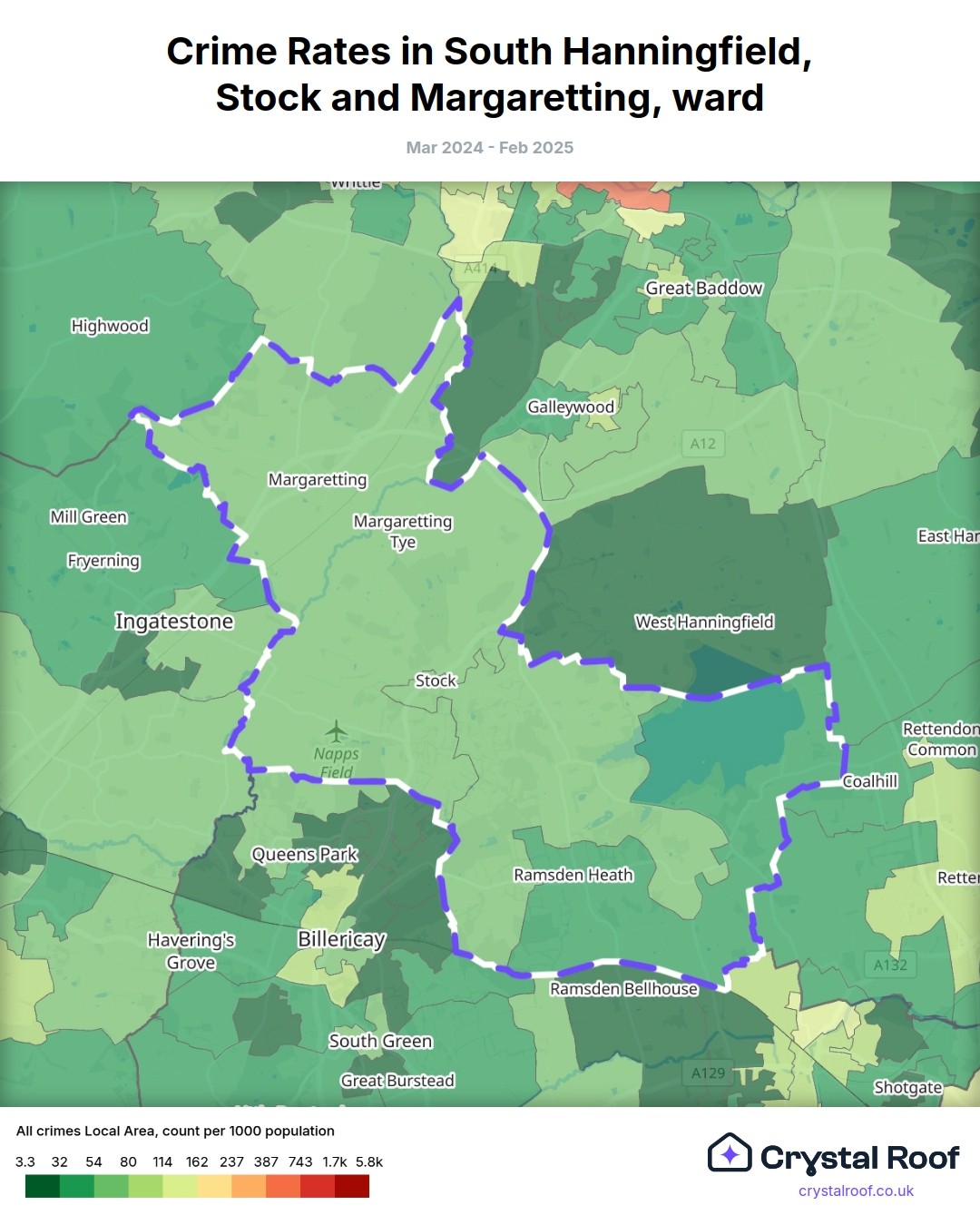 South Hanningfield, Stock and Margaretting, (ward) includes areas with the following crime ratings (see map):