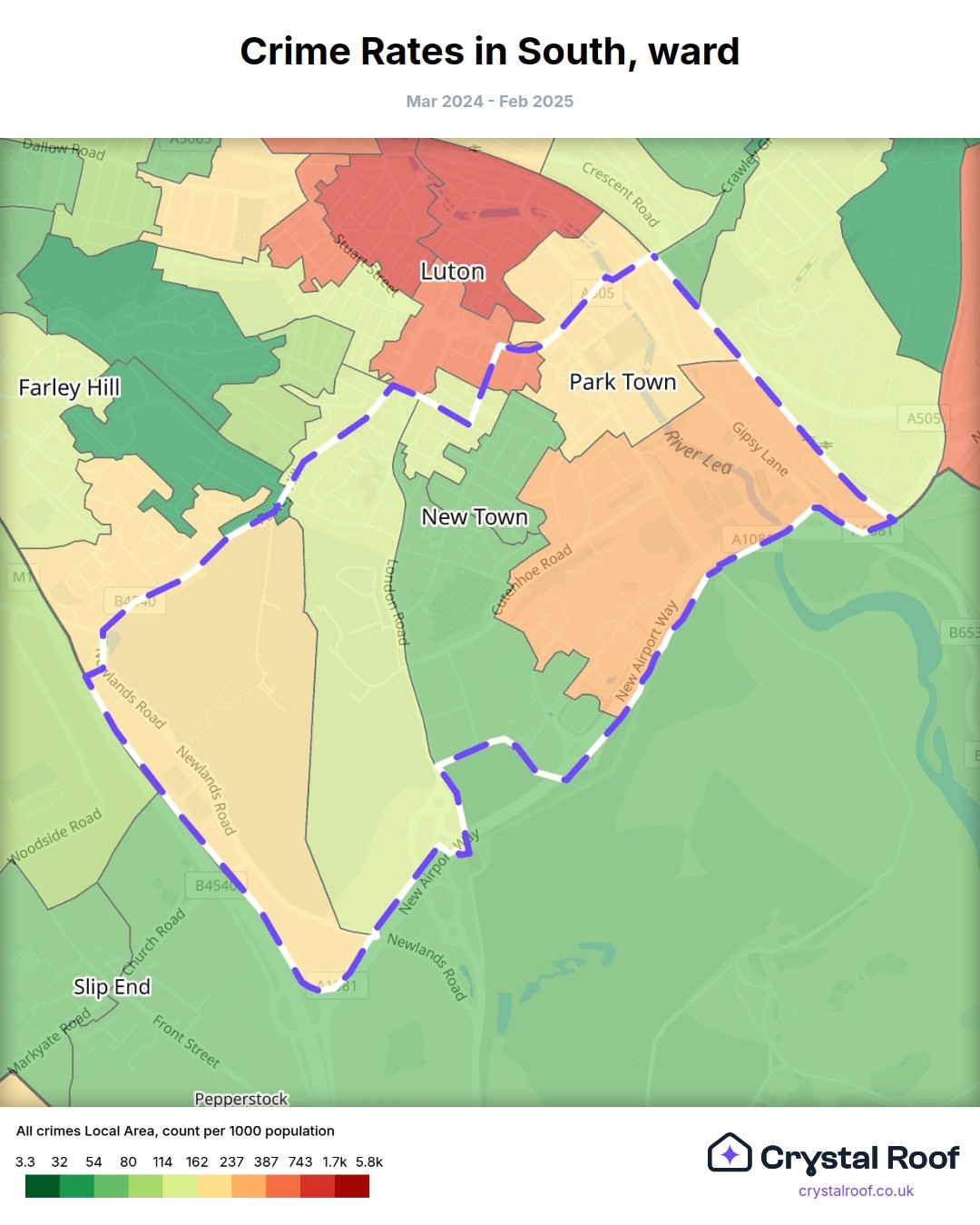 South (ward) is located within Luton (borough). Annual total crime rate in Luton (borough) is 101 crimes per thousand resident population, which can be rated as 4 out of 10 or low crime level compared to other local authority districts in England and Wales.