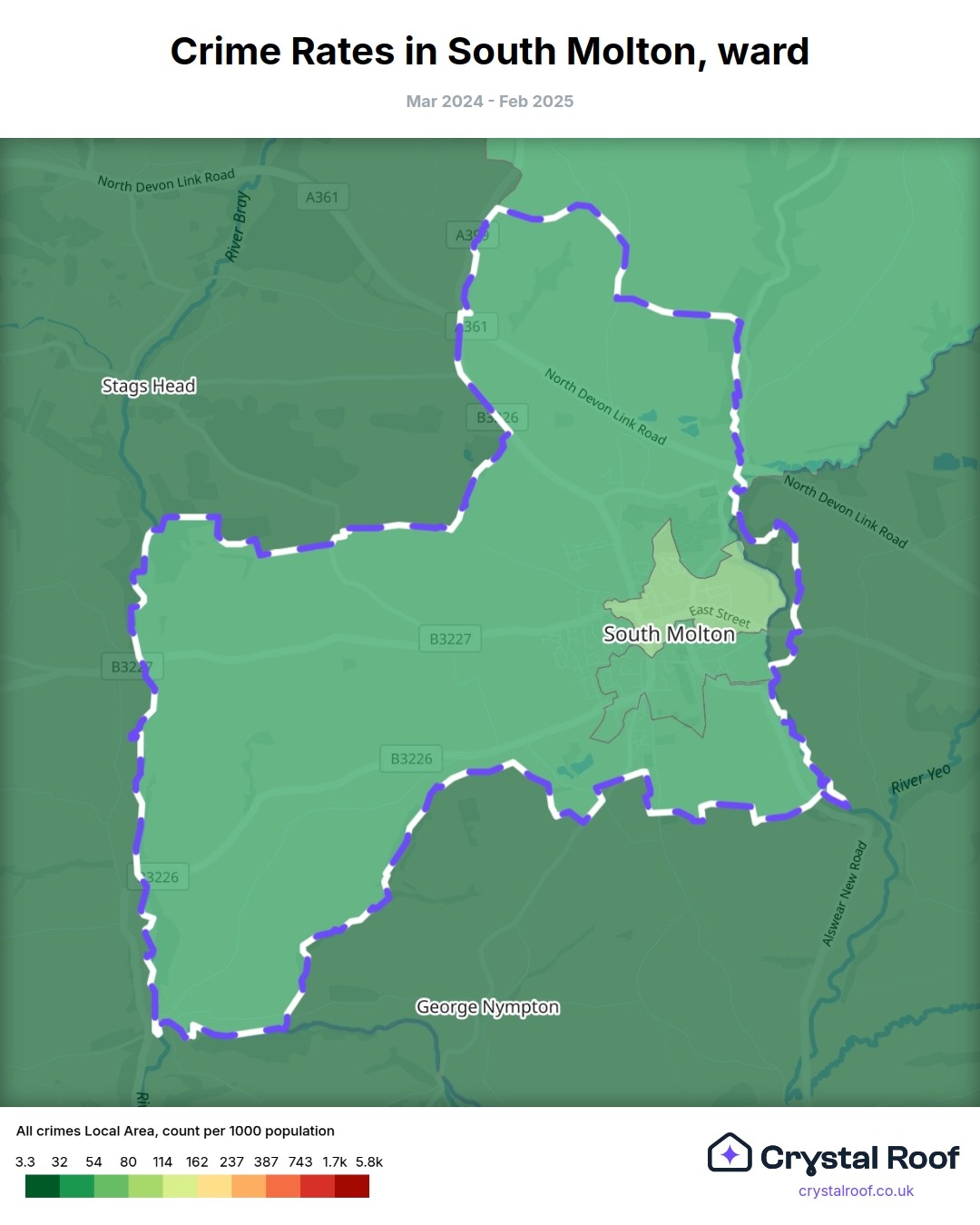 South Molton, (ward) includes areas with the following crime ratings (see map):