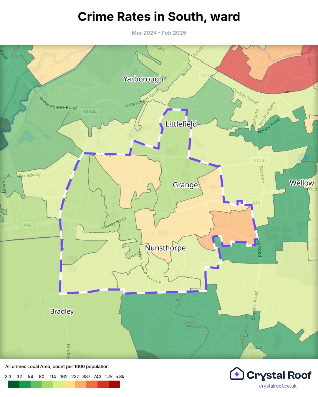 South (ward) is located within North East Lincolnshire (borough). Annual total crime rate in North East Lincolnshire (borough) is 125 crimes per thousand resident population, which can be rated as 6 out of 10 or medium crime level compared to other local authority districts in England and Wales.