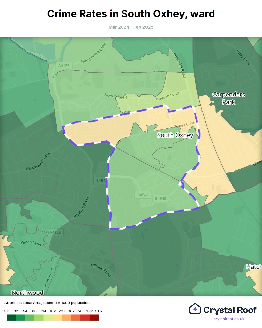 The figures in grey indicate the relative ratings of South Oxhey (ward) for a specific crime type compared to other wards in England and Wales.