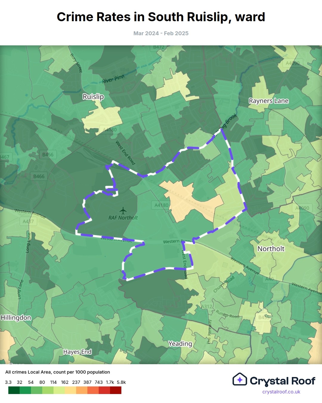 The figures in grey indicate the relative ratings of South Ruislip (ward) for a specific crime type compared to other wards in England and Wales.