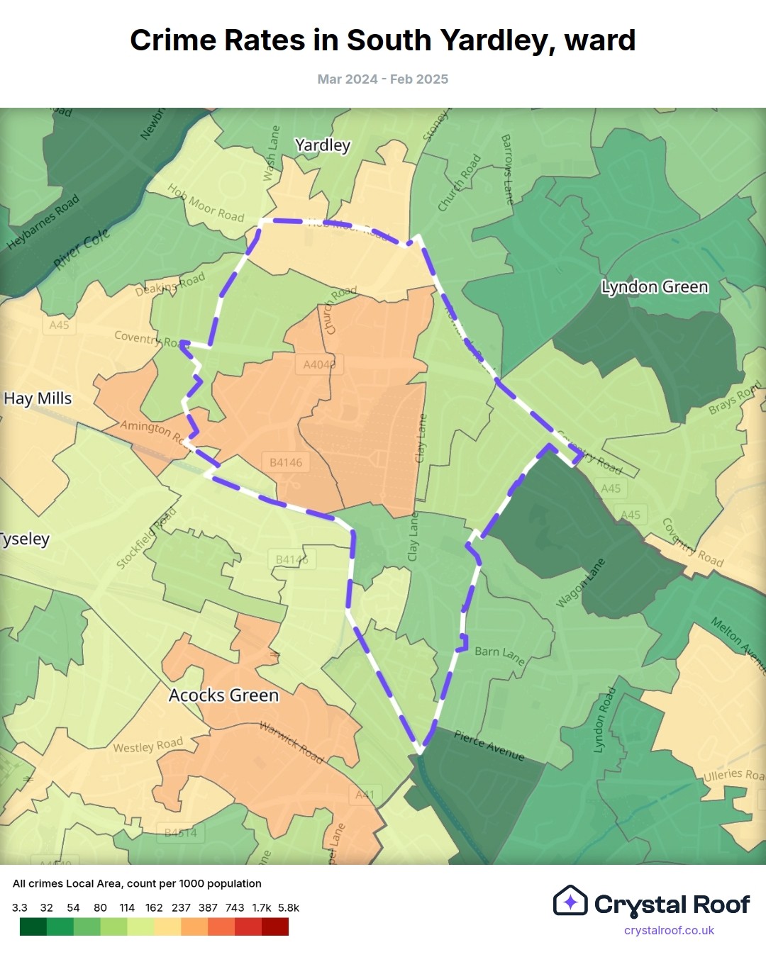 South Yardley, (ward) includes areas with the following crime ratings (see map):