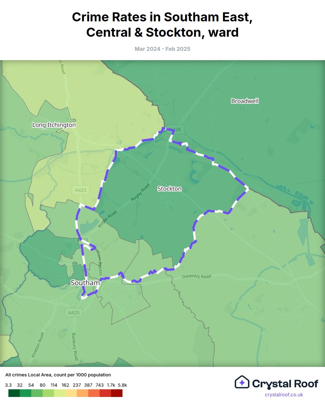 Southam East, Central & Stockton, (ward) includes areas with the following crime ratings (see map):