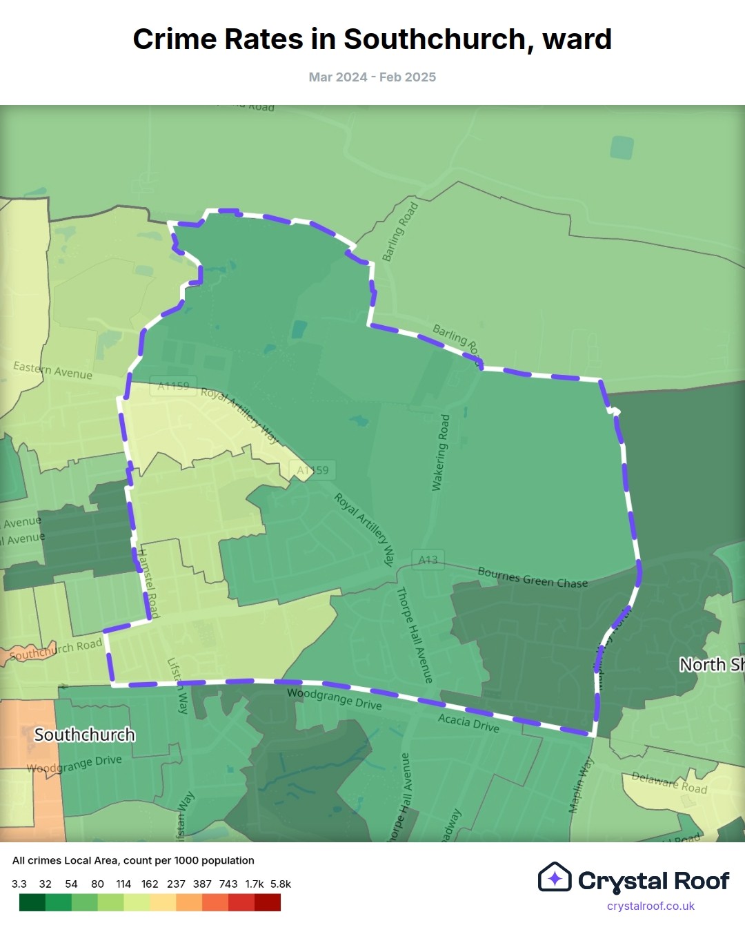 Southchurch, (ward) includes areas with the following crime ratings (see map):