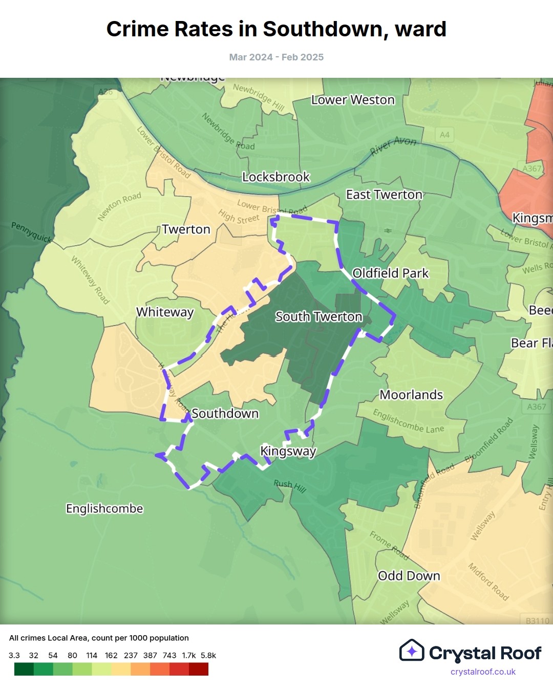 Southdown, (ward) includes areas with the following crime ratings (see map):