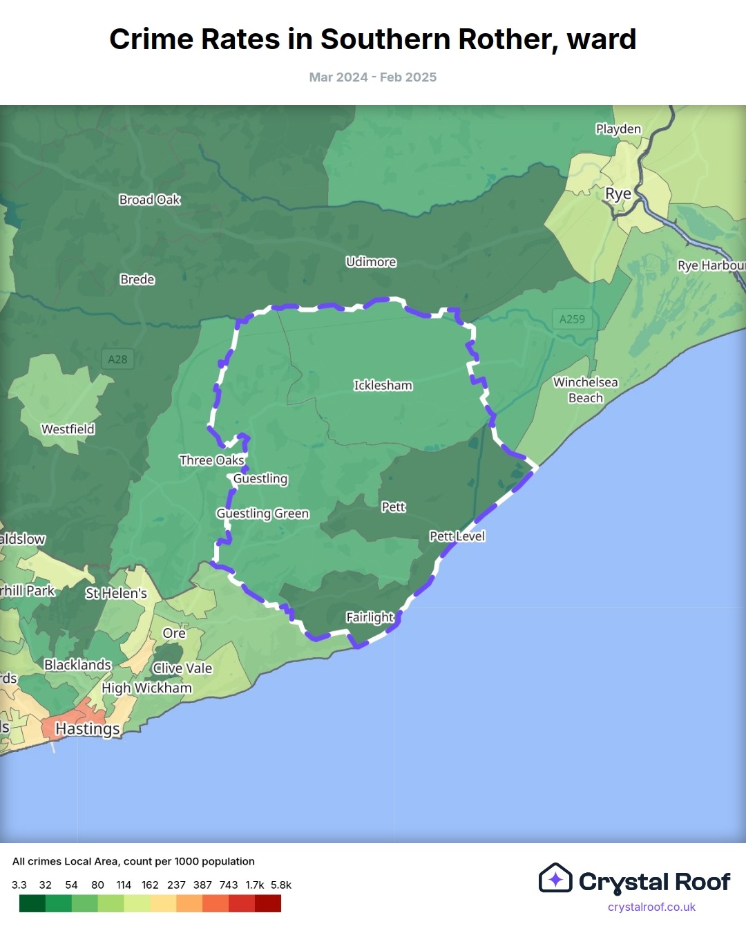 Southern Rother (ward) is located within Rother (borough). Annual total crime rate in Rother (borough) is 68 crimes per thousand resident population, which can be rated as 2 out of 10 or low crime level compared to other local authority districts in England and Wales.