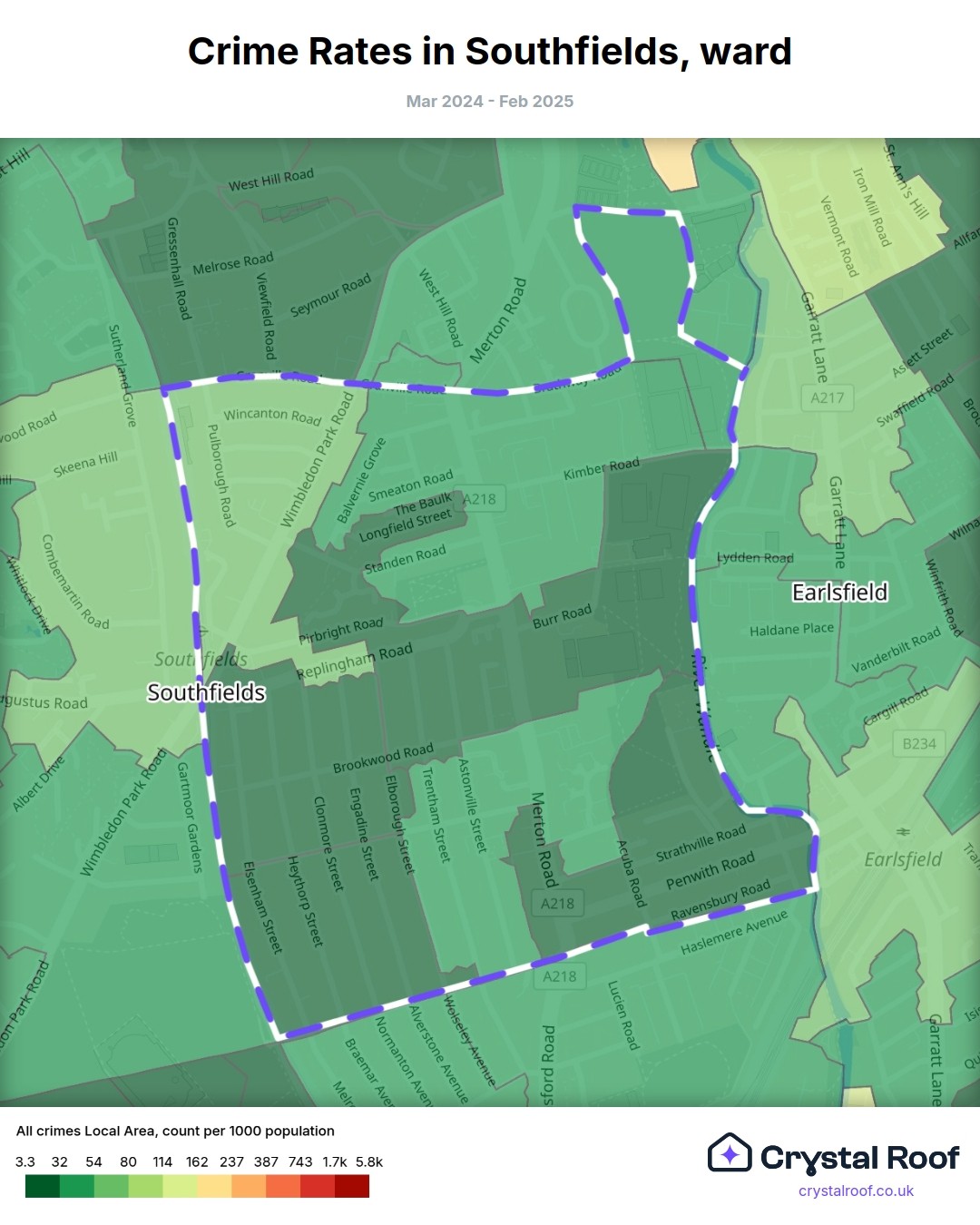 Southfields, (ward) includes areas with the following crime ratings (see map):