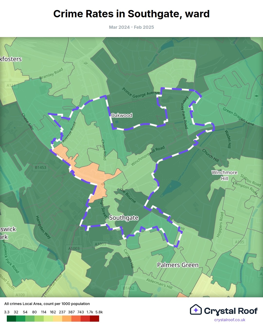 Southgate, (ward) includes areas with the following crime ratings (see map):