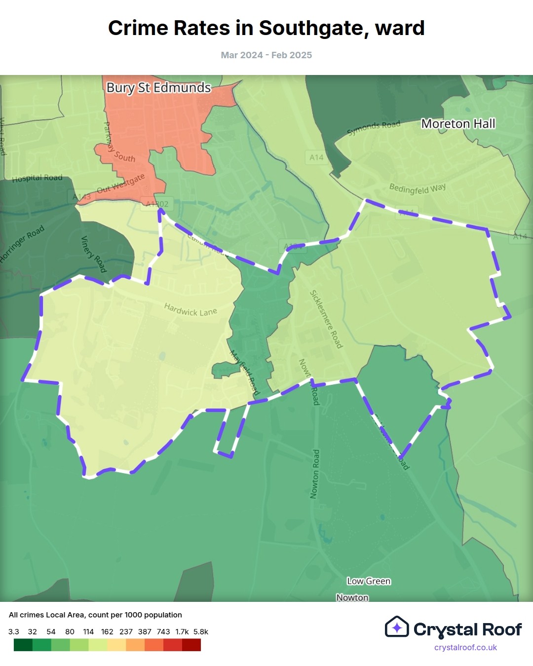 Southgate (ward) is located within West Suffolk (borough). Annual total crime rate in West Suffolk (borough) is 64 crimes per thousand resident population, which can be rated as 2 out of 10 or low crime level compared to other local authority districts in England and Wales.