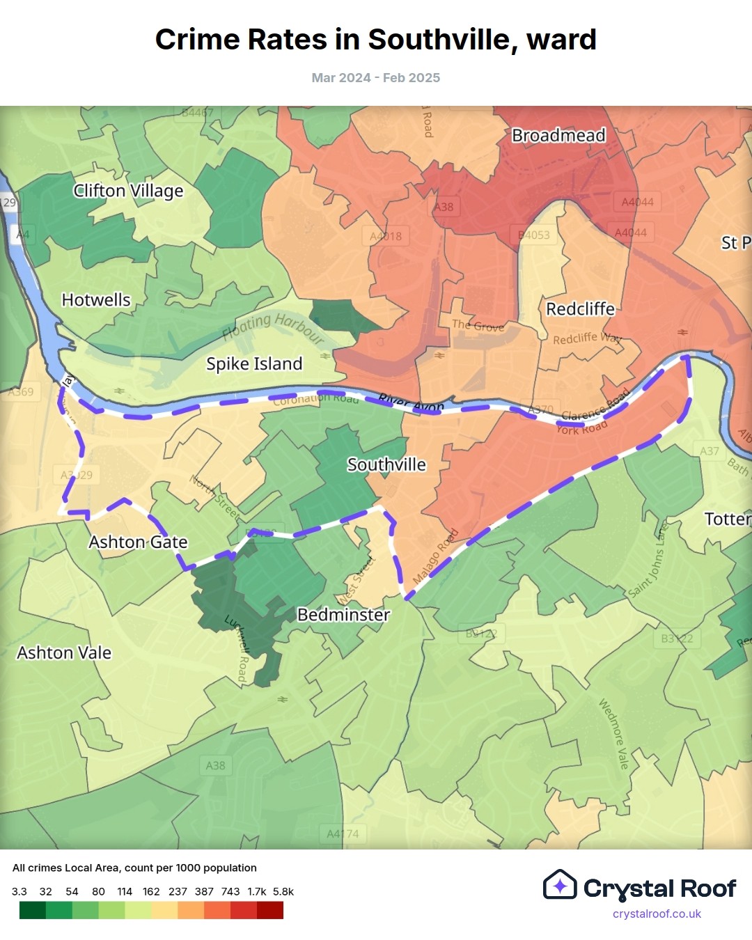 Southville (ward) is located within Bristol, City of (borough). Annual total crime rate in Bristol, City of (borough) is 142 crimes per thousand resident population, which can be rated as 7 out of 10 or high crime level compared to other local authority districts in England and Wales.