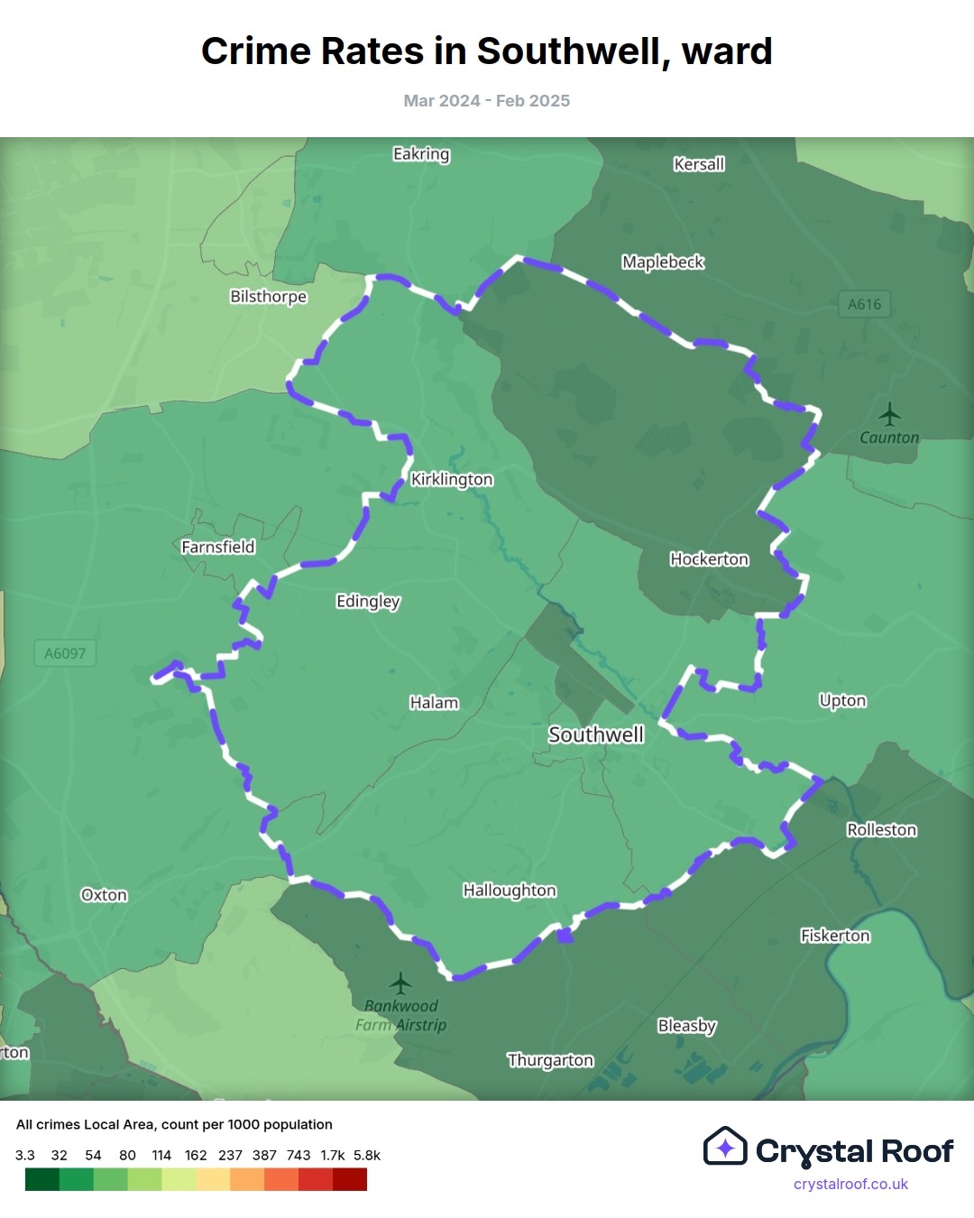 Southwell, (ward) includes areas with the following crime ratings (see map):