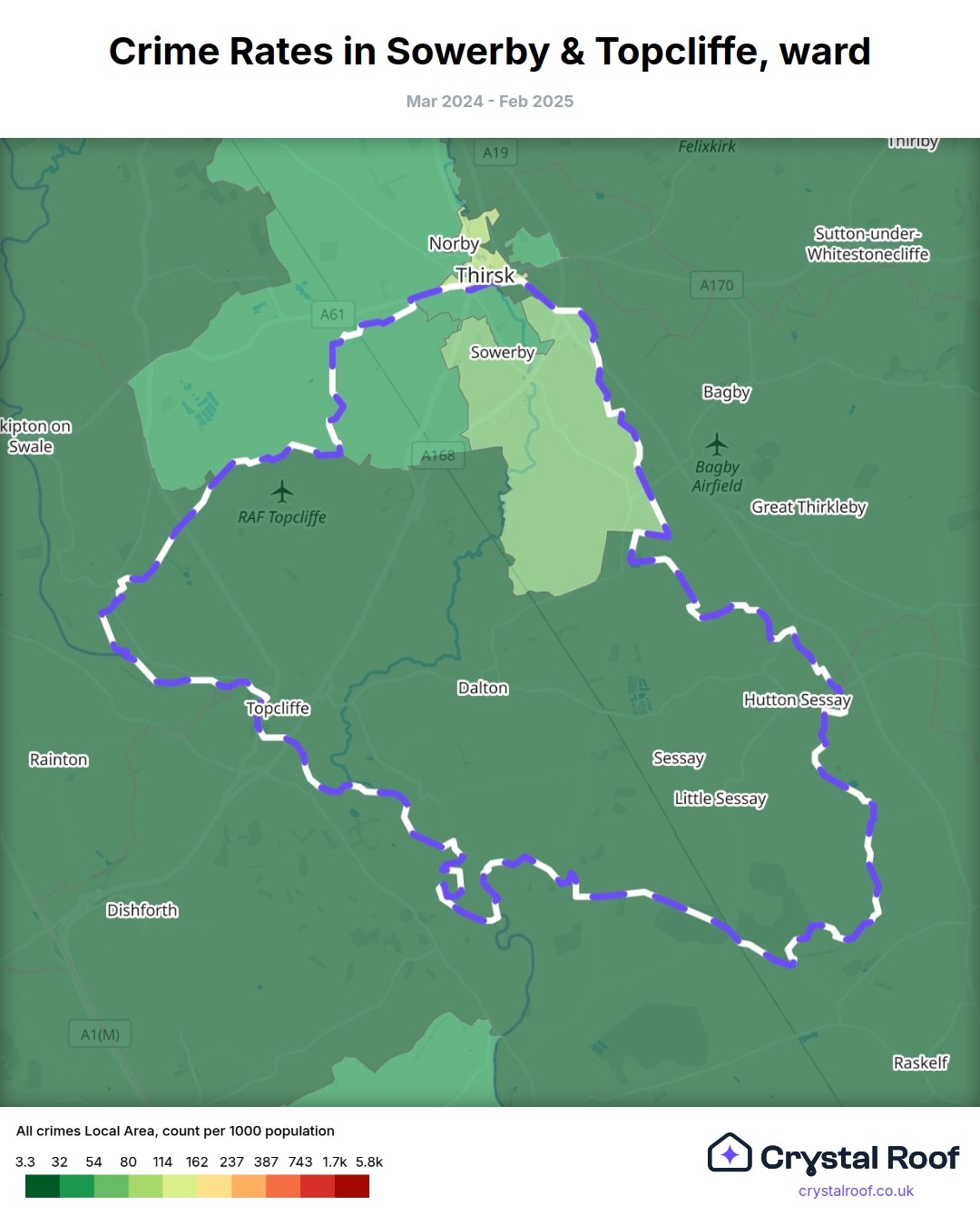 Sowerby & Topcliffe (ward) is located within North Yorkshire (borough). Annual total crime rate in North Yorkshire (borough) is 48.6 crimes per thousand resident population, which can be rated as 1 out of 10 or low crime level compared to other local authority districts in England and Wales.