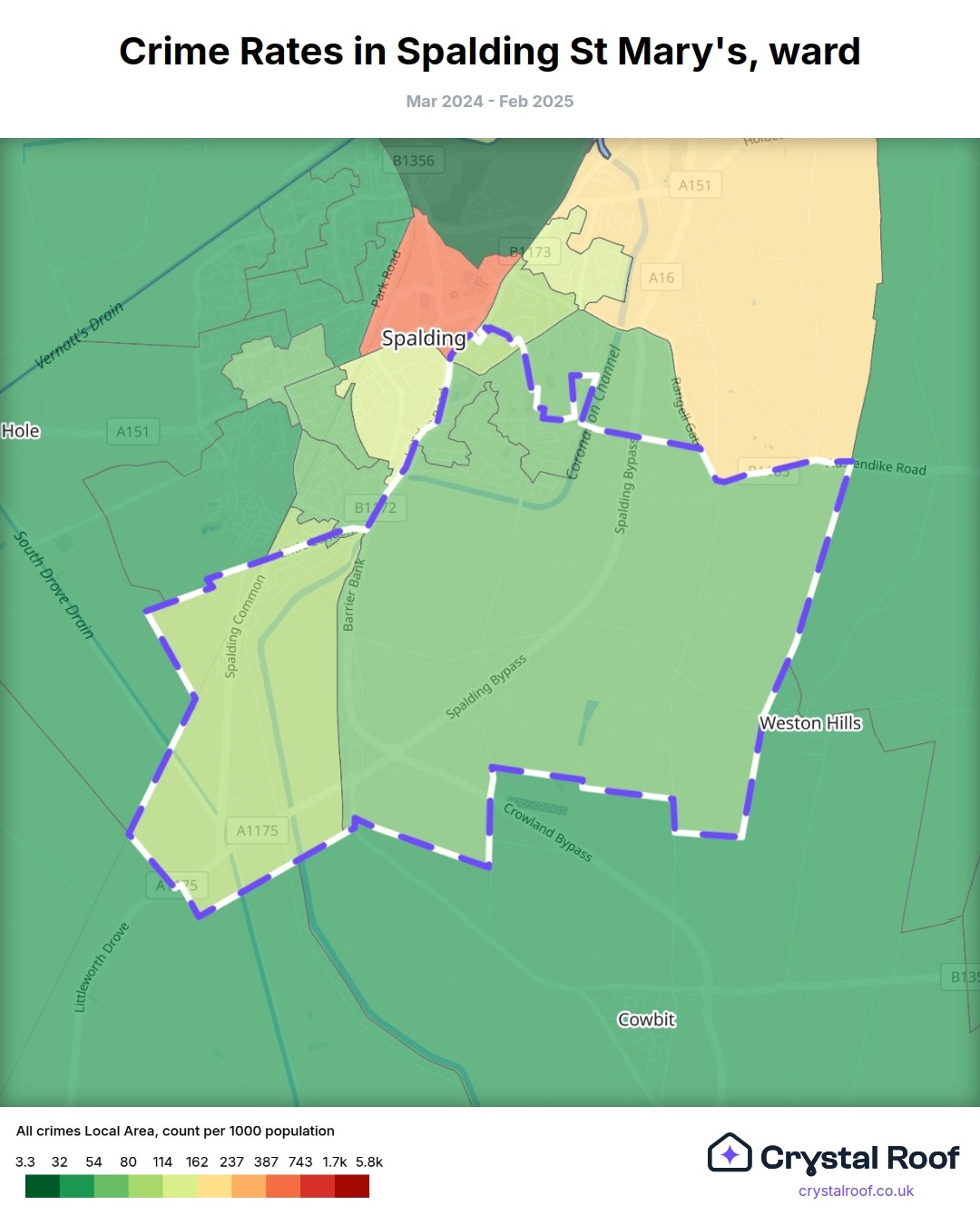 Spalding St Mary's, (ward) includes areas with the following crime ratings (see map):