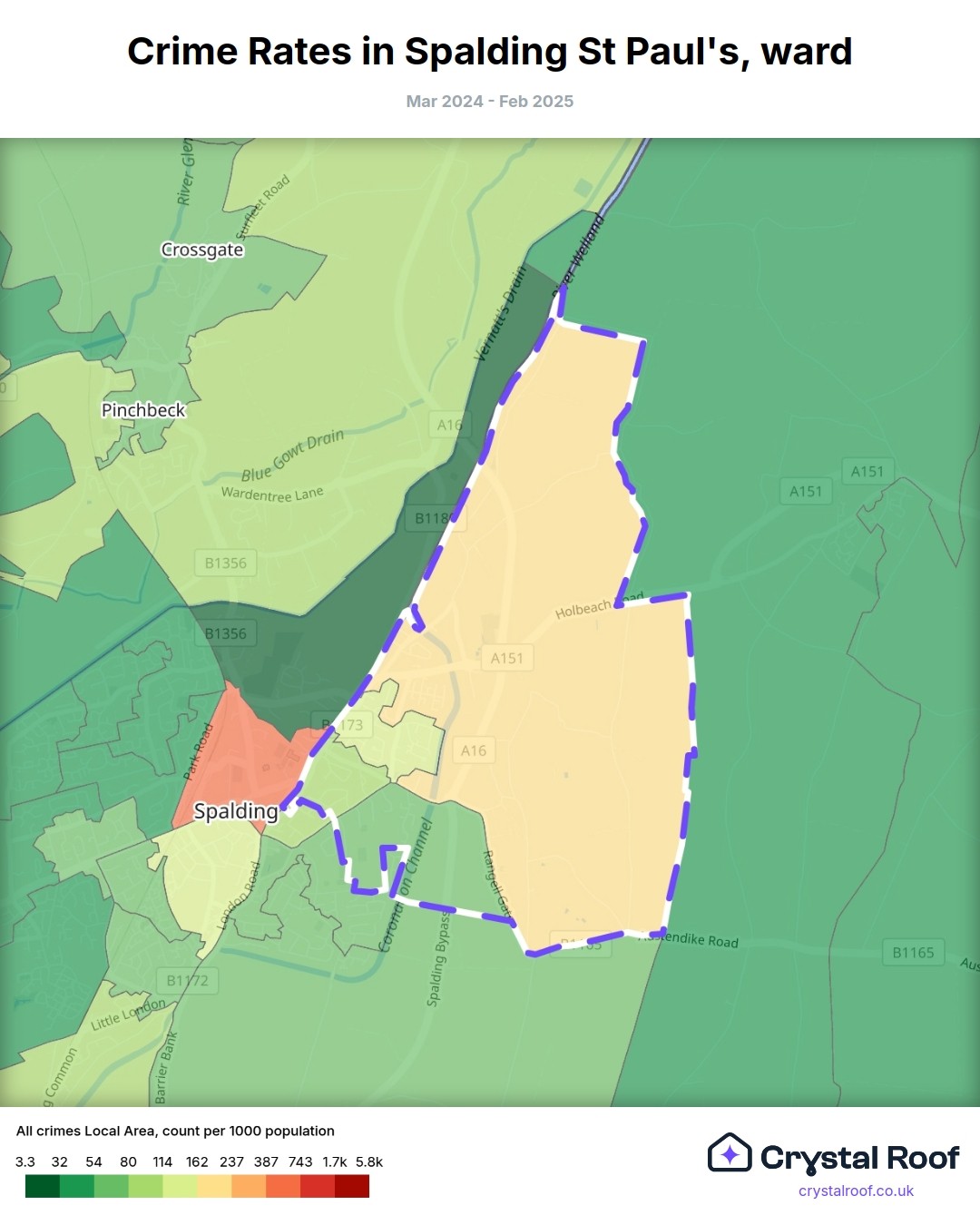 Spalding St Paul's, (ward) includes areas with the following crime ratings (see map):