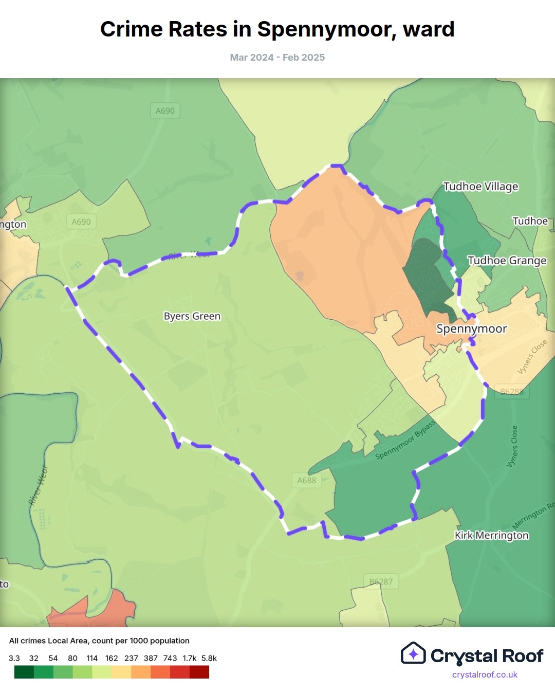 The figures in grey indicate the relative ratings of Spennymoor (ward) for a specific crime type compared to other wards in England and Wales.
