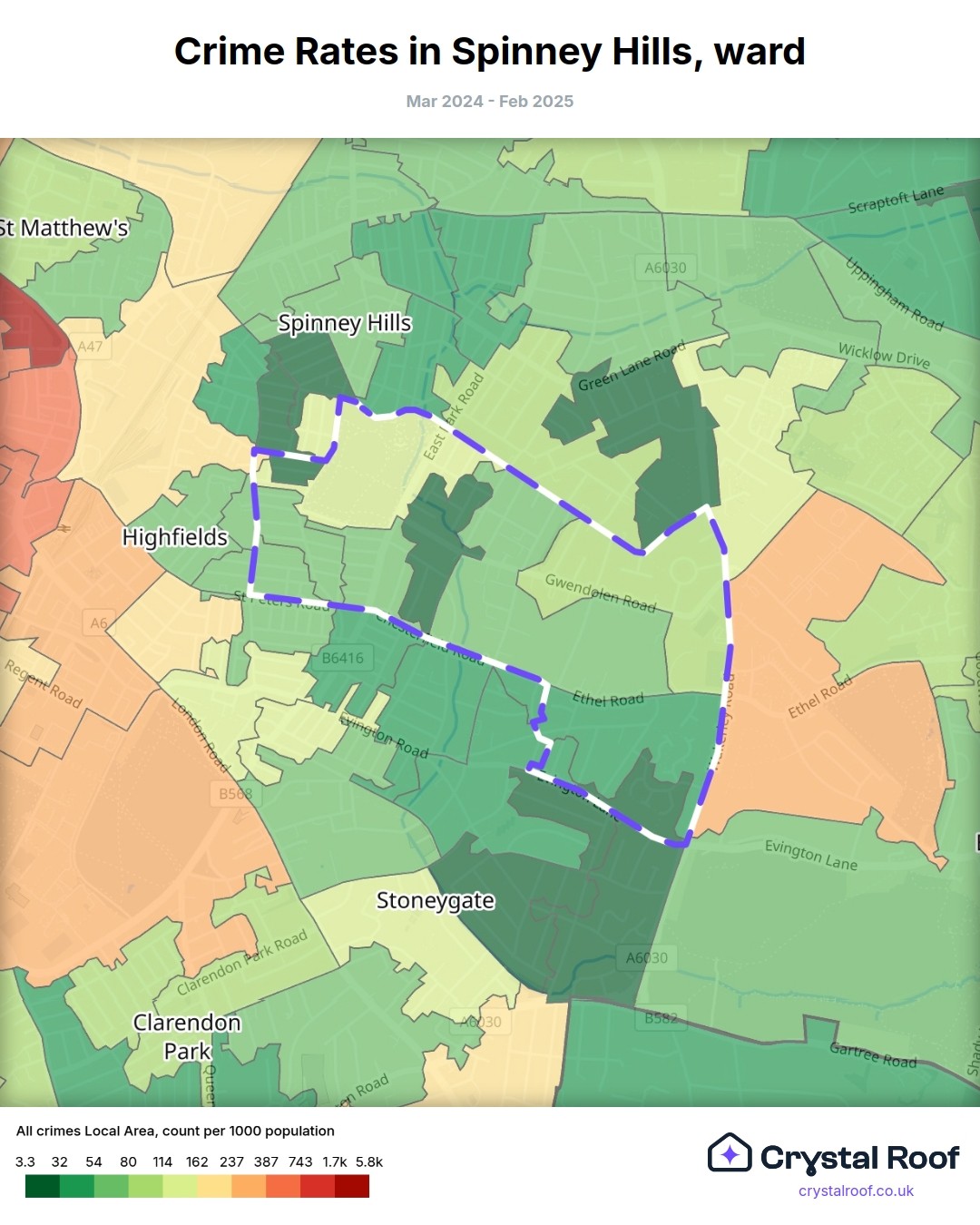 Spinney Hills, (ward) includes areas with the following crime ratings (see map):