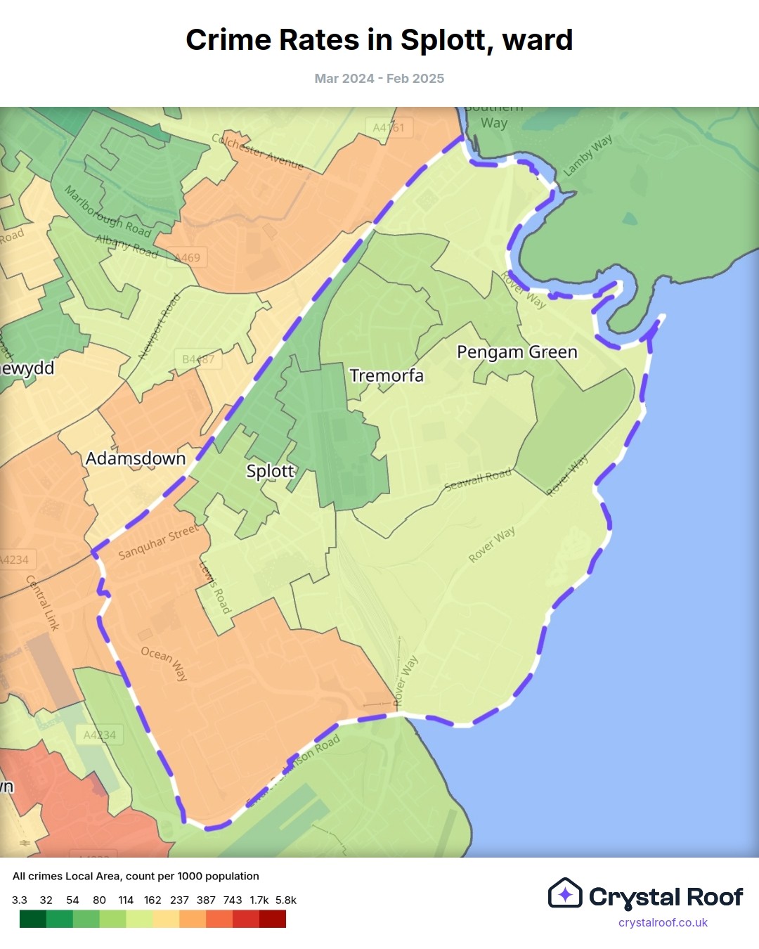 Splott, (ward) includes areas with the following crime ratings (see map):