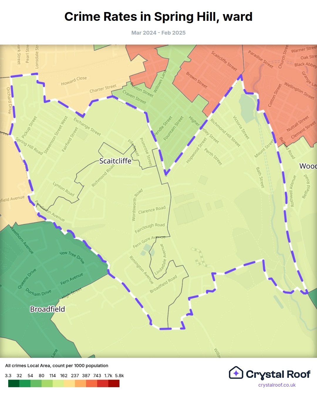 Spring Hill, (ward) includes areas with the following crime ratings (see map):