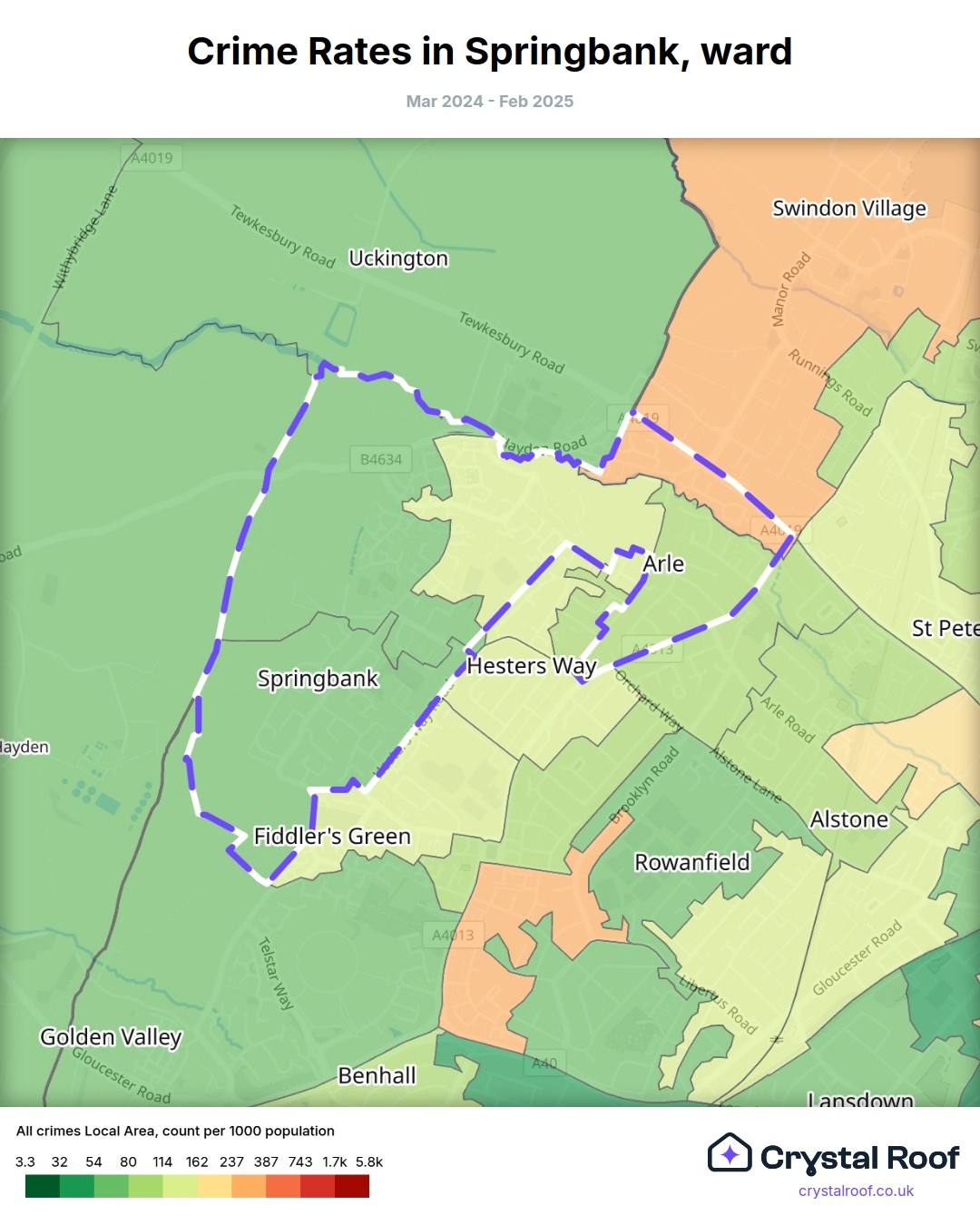 Springbank (ward) is located within Cheltenham (borough). Annual total crime rate in Cheltenham (borough) is 107 crimes per thousand resident population, which can be rated as 5 out of 10 or medium crime level compared to other local authority districts in England and Wales.