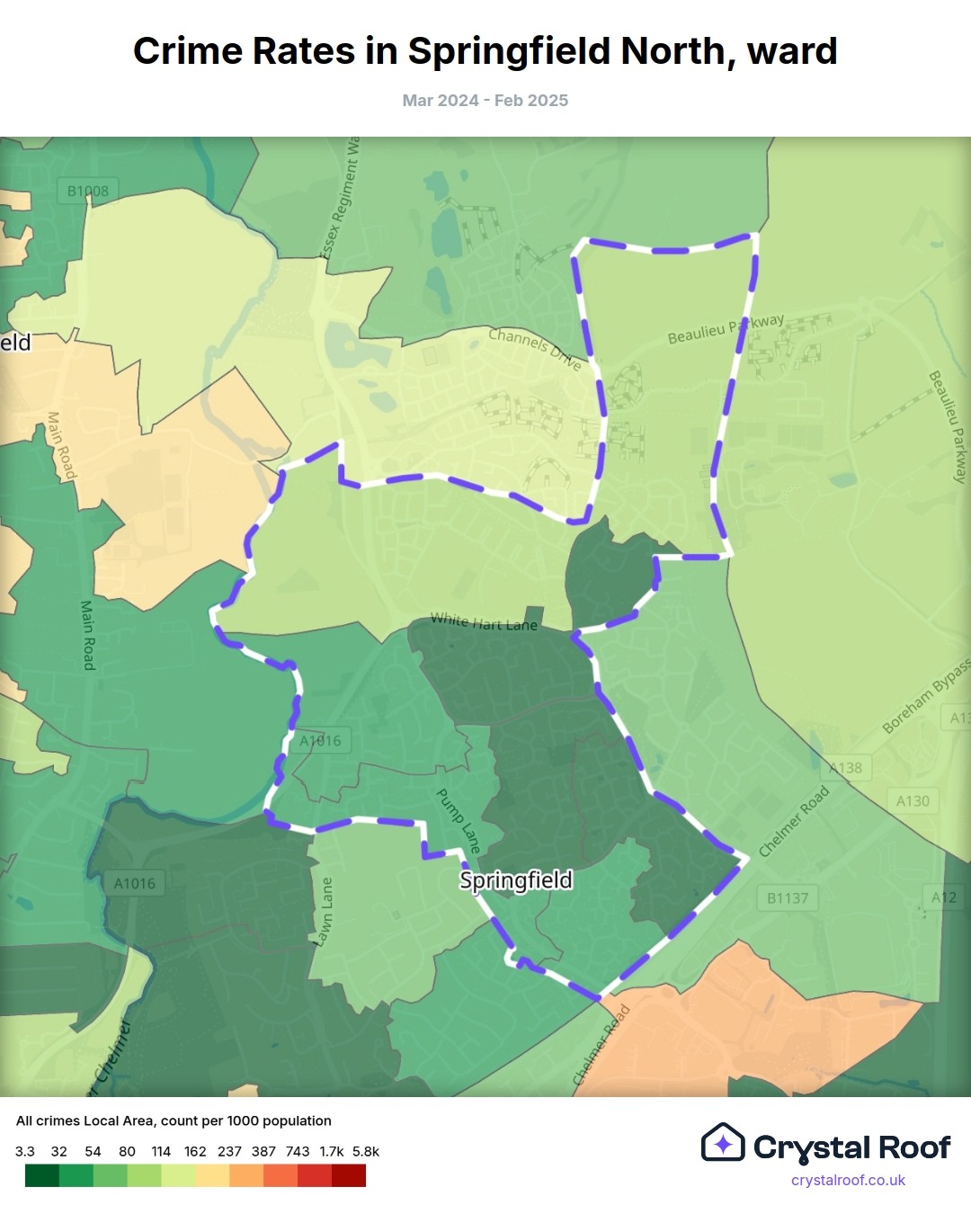 Springfield North (ward) is located within Chelmsford (borough). Annual total crime rate in Chelmsford (borough) is 80.7 crimes per thousand resident population, which can be rated as 3 out of 10 or low crime level compared to other local authority districts in England and Wales.