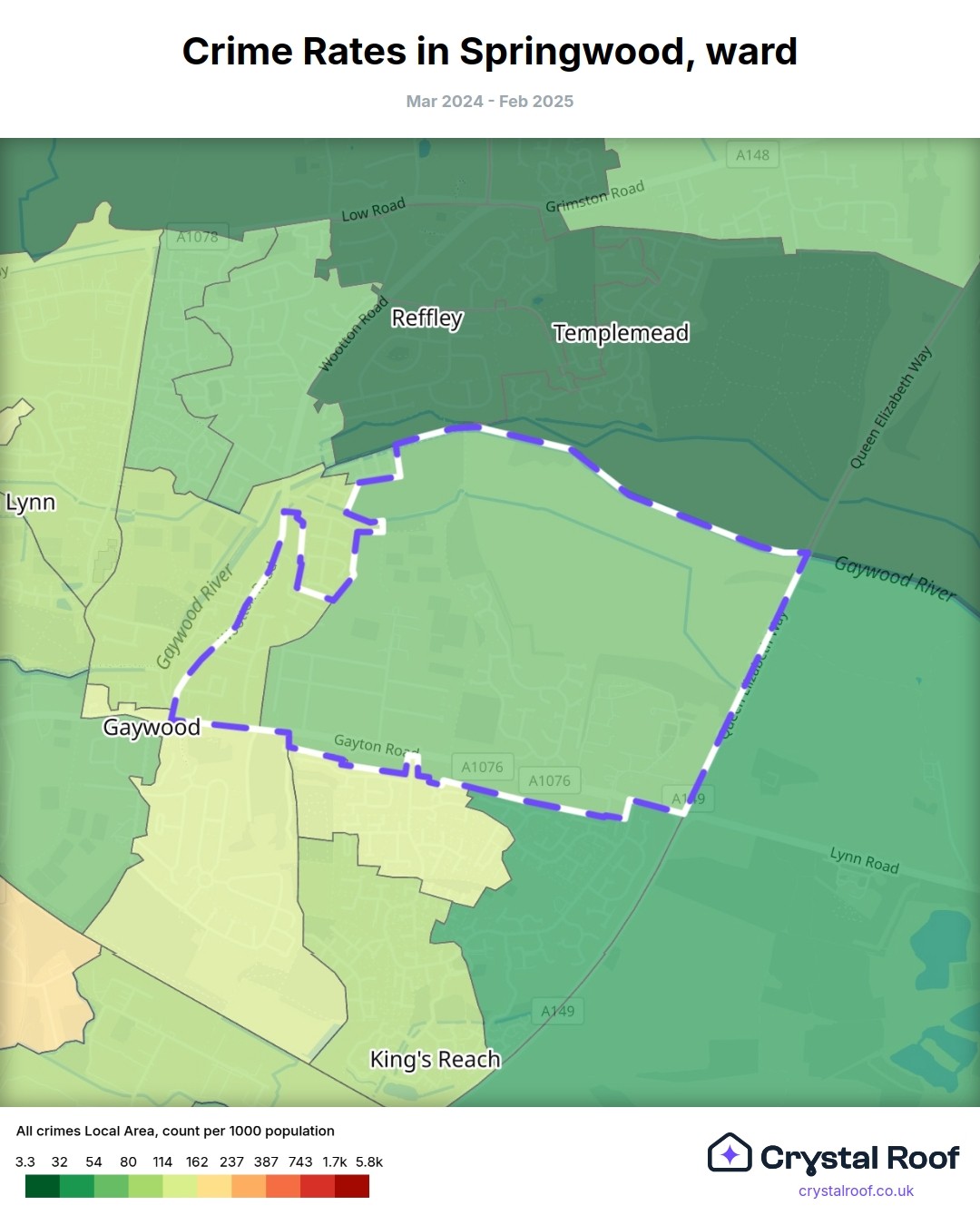 Springwood (ward) is located within King's Lynn and West Norfolk (borough). Annual total crime rate in King's Lynn and West Norfolk (borough) is 68 crimes per thousand resident population, which can be rated as 2 out of 10 or low crime level compared to other local authority districts in England and Wales.