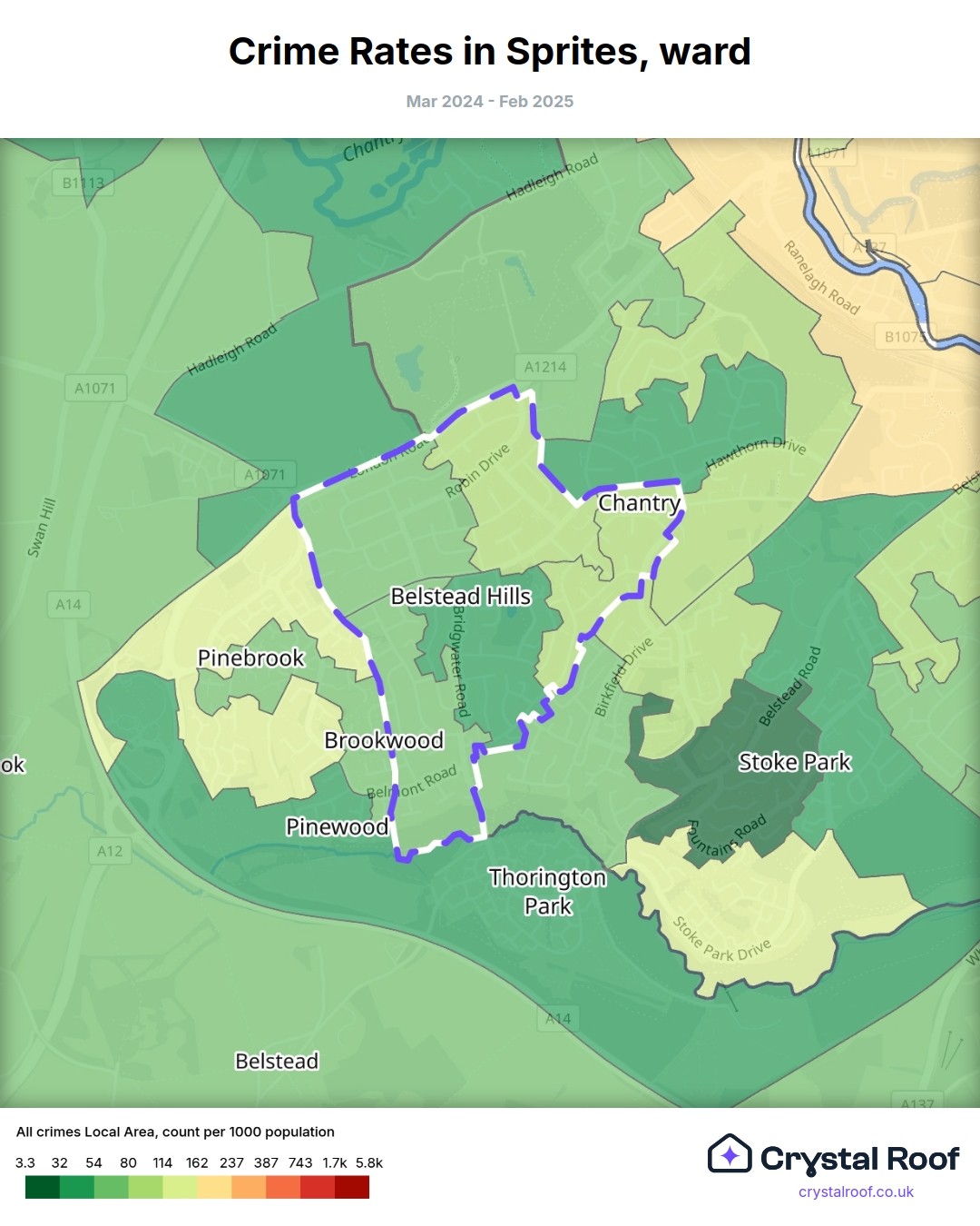 Sprites (ward) is located within Ipswich (borough). Annual total crime rate in Ipswich (borough) is 96.1 crimes per thousand resident population, which can be rated as 4 out of 10 or low crime level compared to other local authority districts in England and Wales.