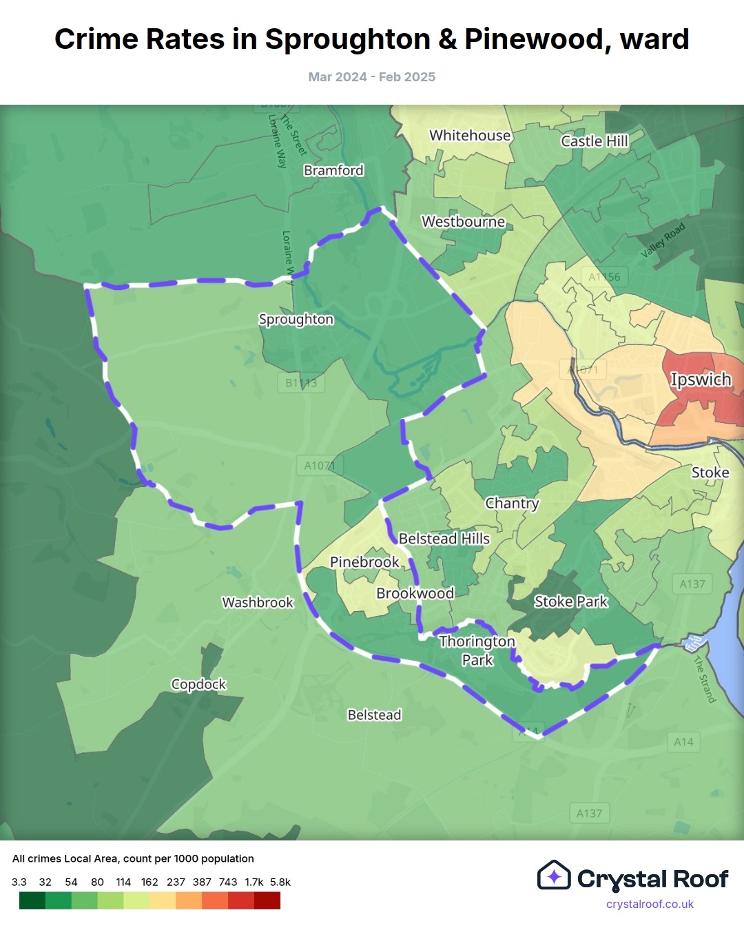 Sproughton & Pinewood, (ward) includes areas with the following crime ratings (see map):
