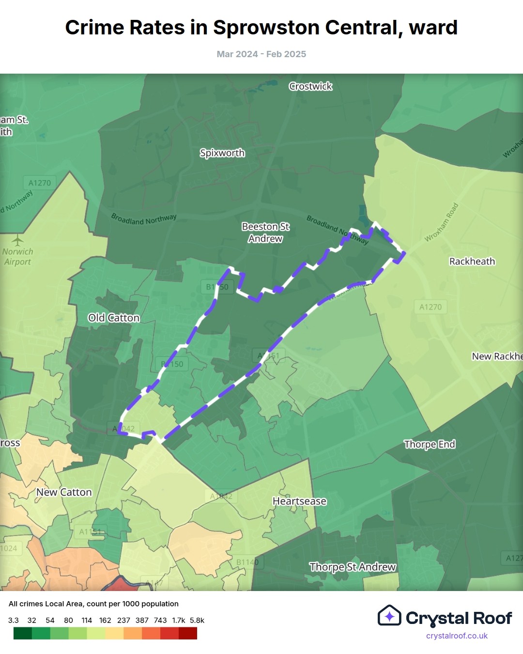 The figures in grey indicate the relative ratings of Sprowston Central (ward) for a specific crime type compared to other wards in England and Wales.