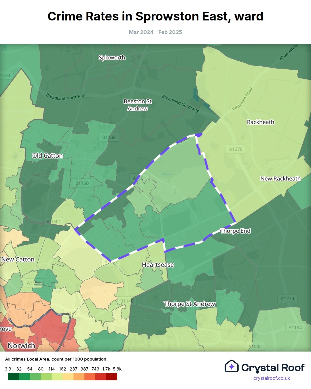 Sprowston East, (ward) includes areas with the following crime ratings (see map):
