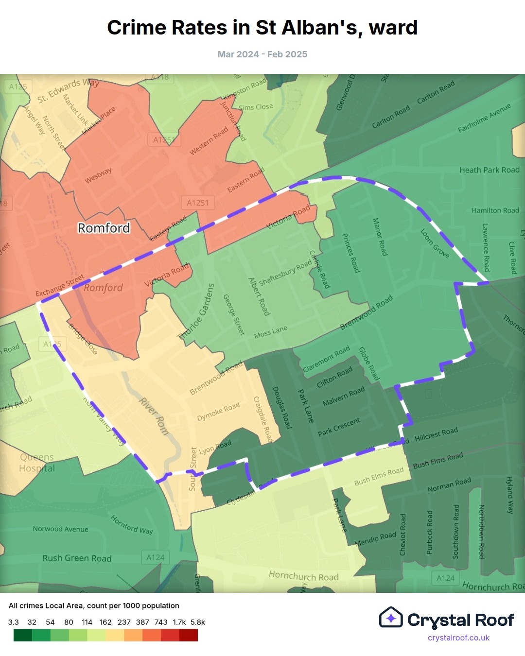 The figures in grey indicate the relative ratings of St Alban's (ward) for a specific crime type compared to other wards in England and Wales.