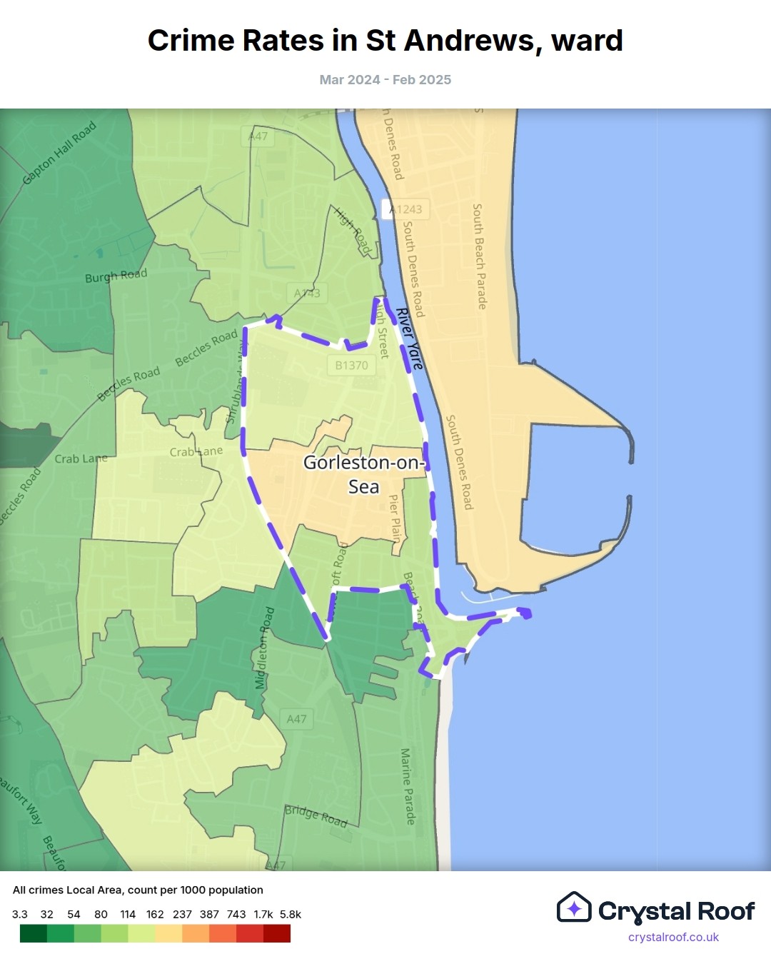 St Andrews (ward) is located within Great Yarmouth (borough). Annual total crime rate in Great Yarmouth (borough) is 114 crimes per thousand resident population, which can be rated as 5 out of 10 or medium crime level compared to other local authority districts in England and Wales.