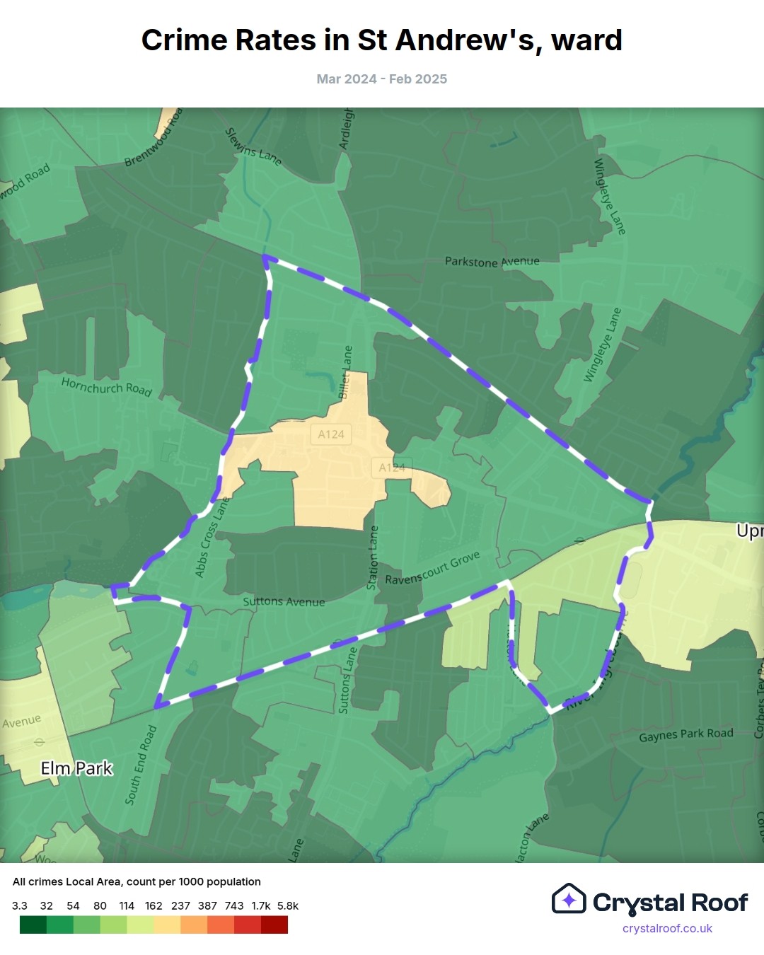 St Andrew's (ward) is located within Havering (borough). Annual total crime rate in Havering (borough) is 92.9 crimes per thousand resident population, which can be rated as 4 out of 10 or low crime level compared to other local authority districts in England and Wales.