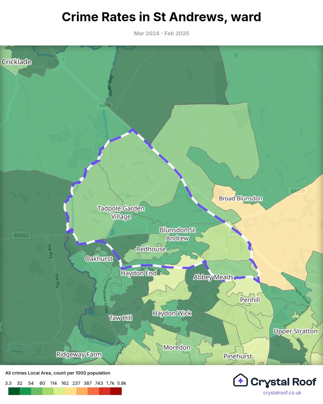 St Andrews (ward) is located within Swindon (borough). Annual total crime rate in Swindon (borough) is 86.5 crimes per thousand resident population, which can be rated as 4 out of 10 or low crime level compared to other local authority districts in England and Wales.
