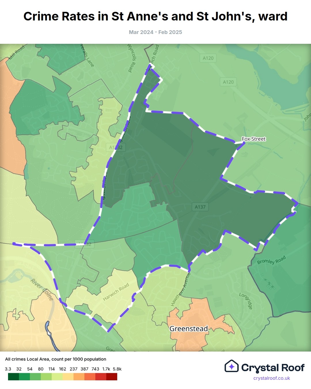 St Anne's and St John's (ward) is located within Colchester (borough). Annual total crime rate in Colchester (borough) is 91.9 crimes per thousand resident population, which can be rated as 4 out of 10 or low crime level compared to other local authority districts in England and Wales.