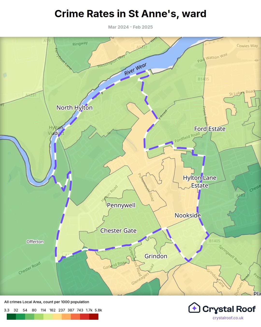 St Anne's (ward) is located within Sunderland (borough). Annual total crime rate in Sunderland (borough) is 122 crimes per thousand resident population, which can be rated as 6 out of 10 or medium crime level compared to other local authority districts in England and Wales.
