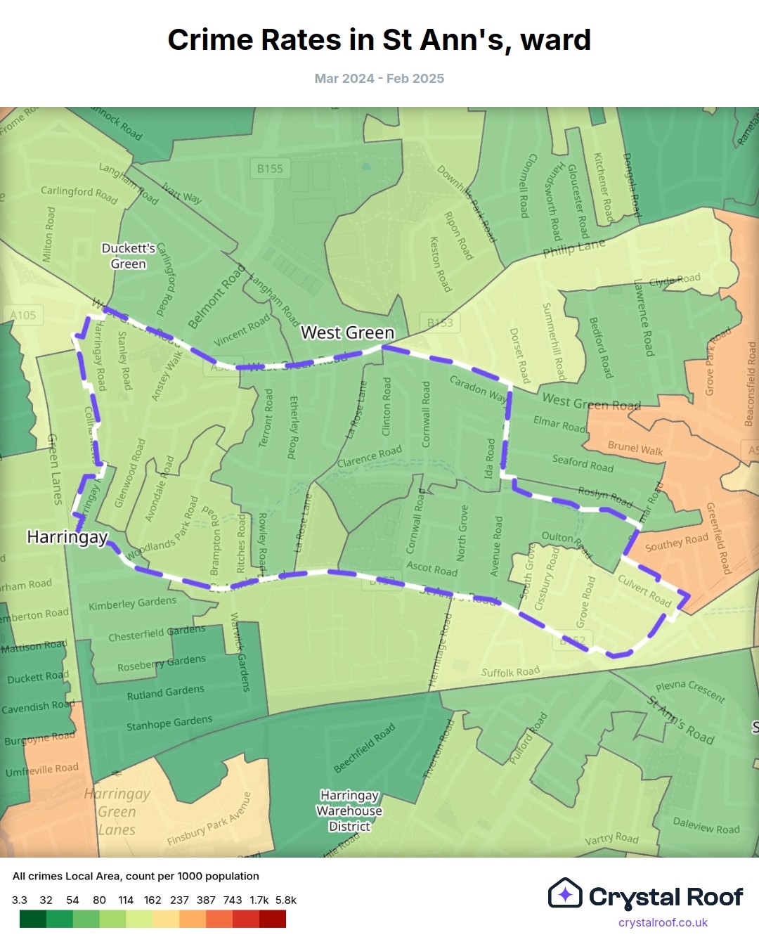 St Ann's (ward) is located within Haringey (borough). Annual total crime rate in Haringey (borough) is 138 crimes per thousand resident population, which can be rated as 7 out of 10 or high crime level compared to other local authority districts in England and Wales.