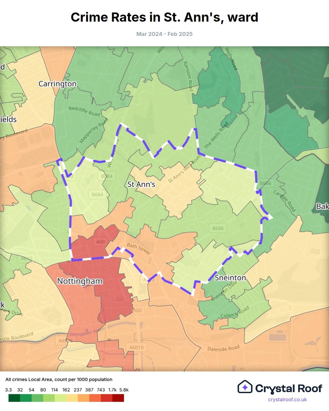 St. Ann's (ward) is located within Nottingham (borough). Annual total crime rate in Nottingham (borough) is 146 crimes per thousand resident population, which can be rated as 7 out of 10 or high crime level compared to other local authority districts in England and Wales.
