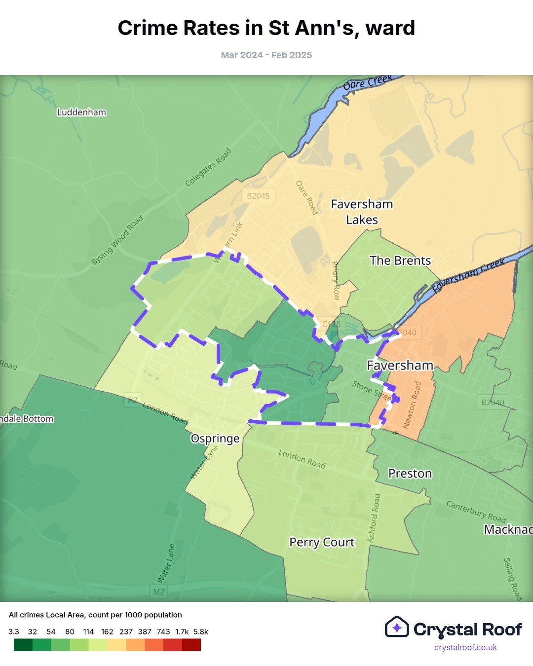 St Ann's (ward) is located within Swale (borough). Annual total crime rate in Swale (borough) is 109 crimes per thousand resident population, which can be rated as 5 out of 10 or medium crime level compared to other local authority districts in England and Wales.