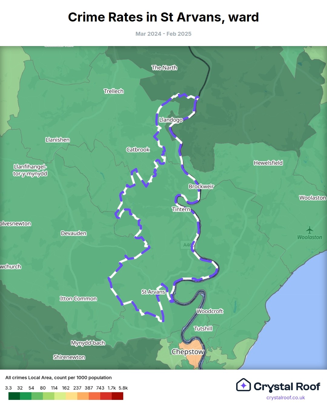 The figures in grey indicate the relative ratings of St Arvans (ward) for a specific crime type compared to other wards in England and Wales.