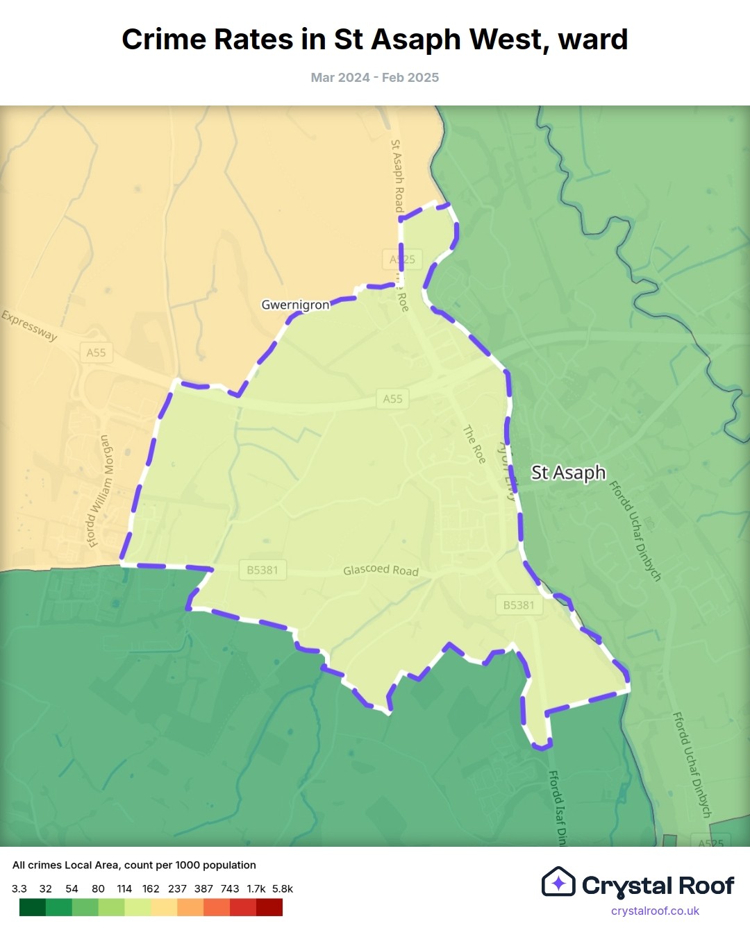 St Asaph West, (ward) includes areas with the following crime ratings (see map):