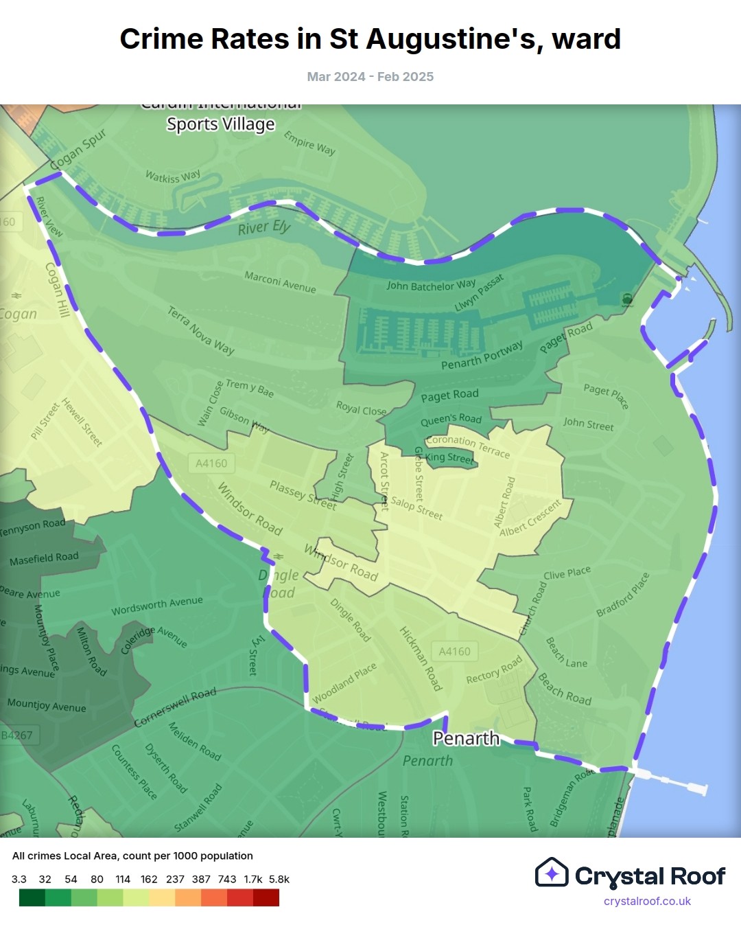 St Augustine's (ward) is located within Vale of Glamorgan (borough). Annual total crime rate in Vale of Glamorgan (borough) is 74.7 crimes per thousand resident population, which can be rated as 3 out of 10 or low crime level compared to other local authority districts in England and Wales.