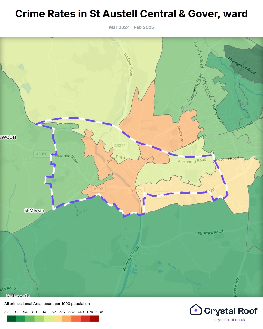 St Austell Central & Gover, (ward) includes areas with the following crime ratings (see map):